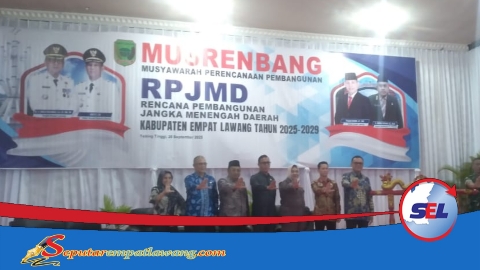EMPAT LAWANG – Bupati Empat Lawang, Dr. H. Joncik Muhamad, didampingi Wakil Bupati Arifai dan Sekretaris Daerah Fauzan Khoiri, Memimpin Musyawarah Perencanaan Pembangunan (Musrenbang) RPJMD 2025-2029 di Gedung Serbaguna Pemerintah Daerah, Kamis (25/9/2025).