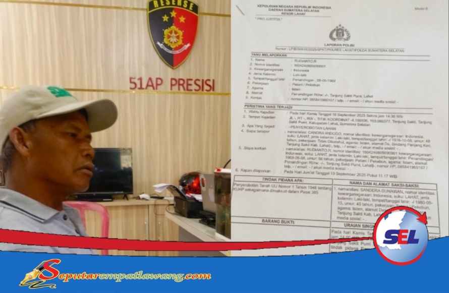 LAHAT – Kasus sengketa lahan kembali terjadi di Kabupaten Lahat. Seorang warga bernama Rudian T.O (56), melaporkan dugaan penyerobotan tanah ke Polres Lahat, Sumatera Selatan. Laporan tersebut tercatat dengan nomor: LP/B/358/IX/2025/SPKT/POLRES LAHAT/POLDA SUMATERA SELATAN.